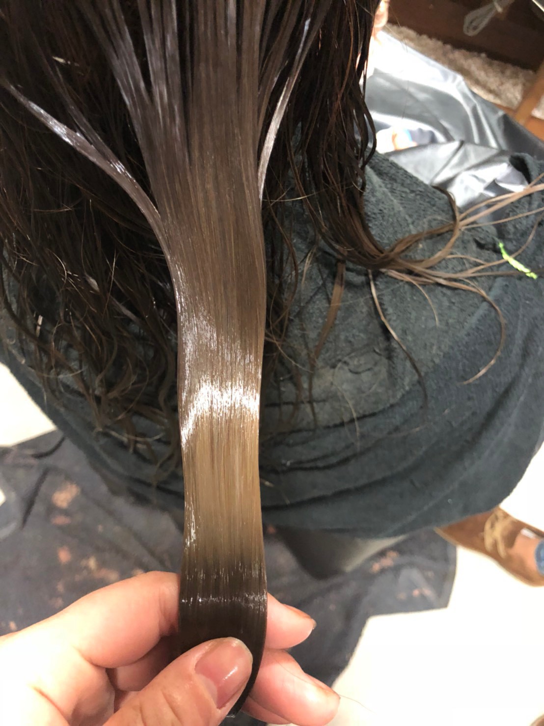 こちらは、中間から毛先がブリーチや日々のドライヤー、アイロンなどでキューティクルが剥がれ、髪の毛に負担がかかってしまった髪です。
